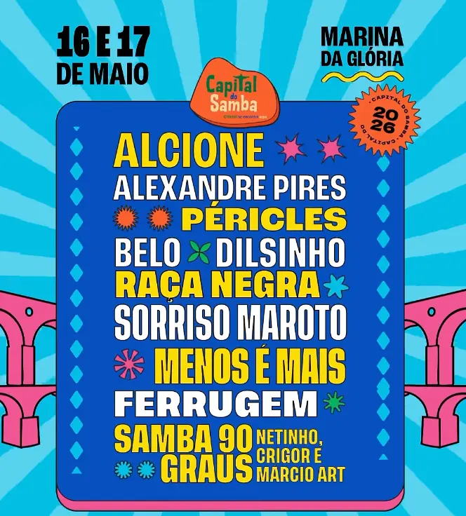 Capital do Samba RJ confirmou mais uma edição para 2026! Neste ano, os dois dias de muito pagode vão acontecer nos dias 16 e 17 de maio, na Marina da Glória!