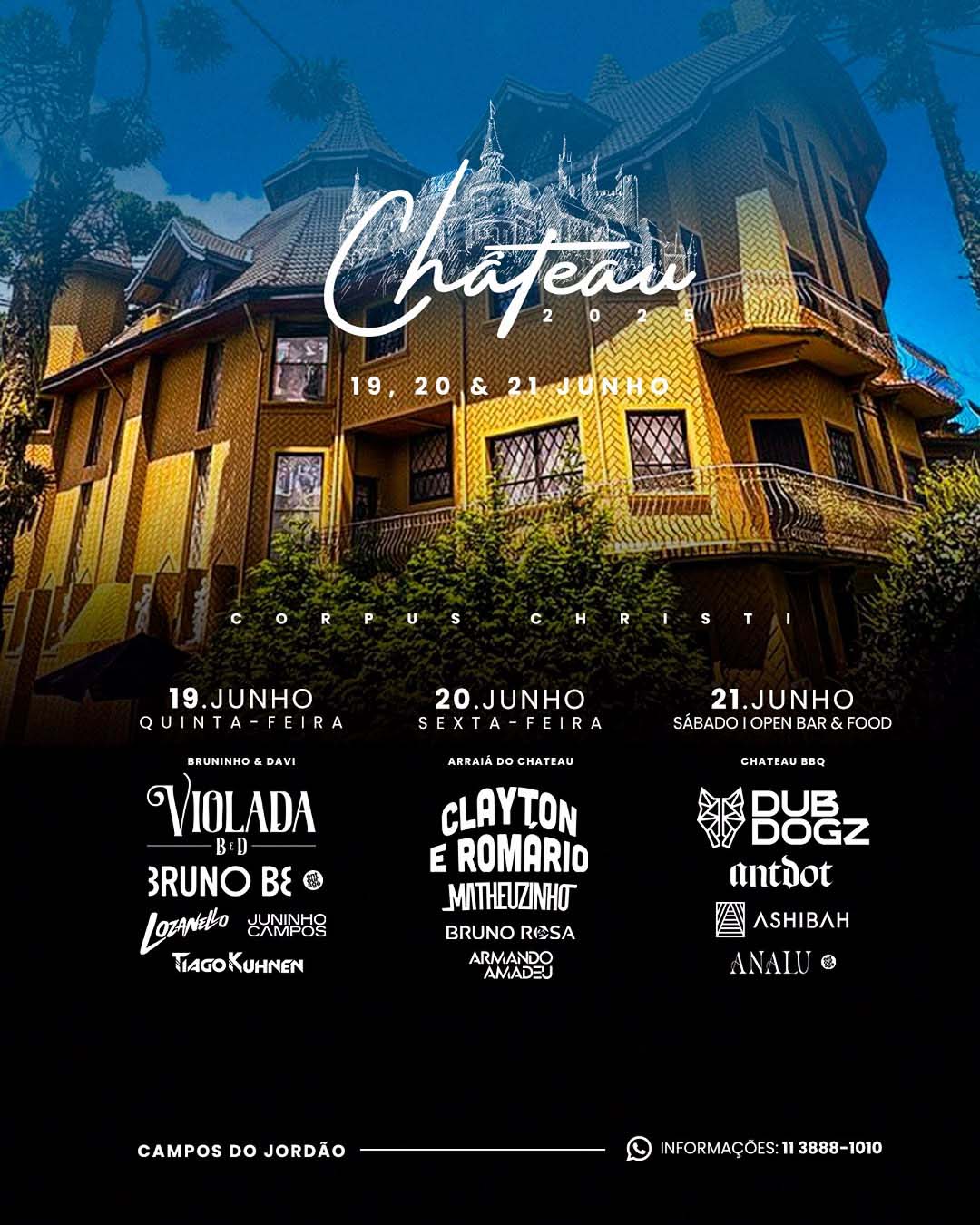 Prepare-se para 3 dias de muita curtição e grandes atrações na temporada 2025 do Chateau Campos do Jordão! Confira os artistas confirmados e a programação por dia.