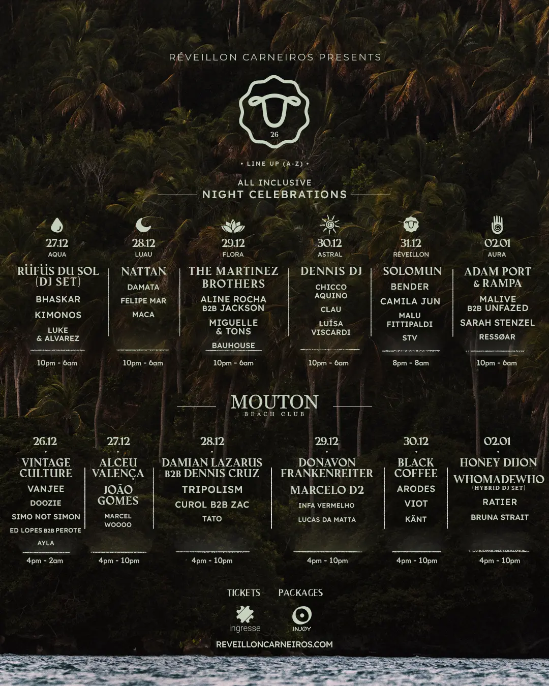 O Réveillon em Carneiros conta com programações durante a tarde no Mouton Beach Club, Villa Mouton, Festas Noturnas all inclusive e muito mais.