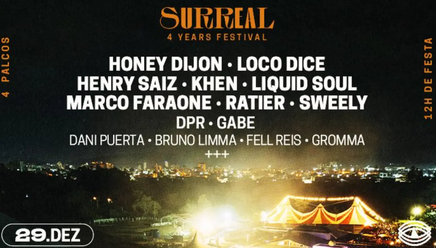 Para comemorar o final do ano no Surreal Park, vem aí a celebração com muita festa de mais um ciclo do club! O line up está incrível, com Honey Dijon, Loco Dice, Henry Saiz, Khen, Liquid Soul, Marco Faraone, Ratier, Sweely, DPR, Gabe, Dani Puerta, Bruno Limma, Fell Reis, Gromma e mais!