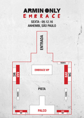 Abertura dos portões: 22:00Club Embrace: 22:00 - 00:00Show principal: 00:00 - 04:00Special Vinyl set by Armin van Buuren: 04:00 - 05:00Fim do show: 05:00