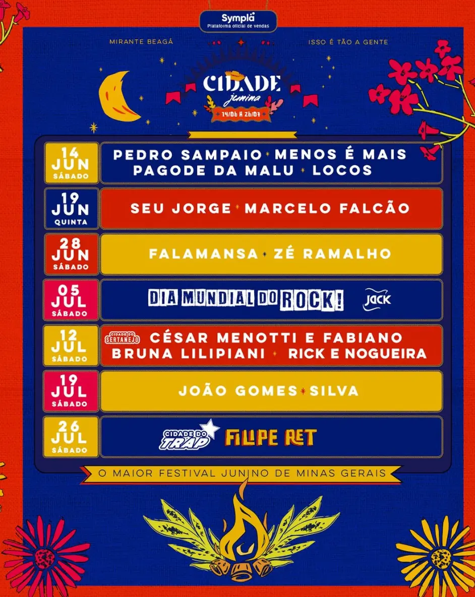 As festas da Cidade Junina tiveram edições anteriores de muito sucesso, aconteceram também no Mirante Beagá e já receberam, por exemplo, artistas como Chitãozinho & Xororó, Falamansa, Alceu Valença e outros nomes da música que agitaram o público.