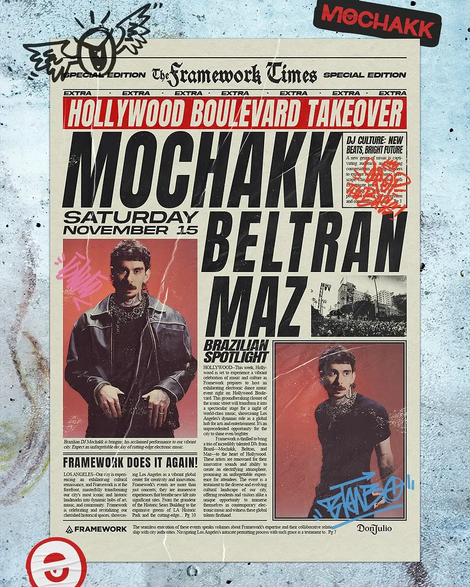 O superstar brasileiro Mochakk retorna a Los Angeles neste outono para sua maior apresentação na Costa Oeste até hoje, assumindo o comando da lendária Hollywood Boulevard em parceria com a Framework. O evento acontece no sábado, 15 de novembro de 2025, marcando o tão esperado retorno de Mochakk aos Estados Unidos após uma série de edições do seu projeto Mochakk Calling em Nova York, Miami e Chicago, além de um pop-up Tricks & Tracks no skatepark de Venice Beach no início deste ano e um show do Mochakk Calling em Denver no final de 2024.