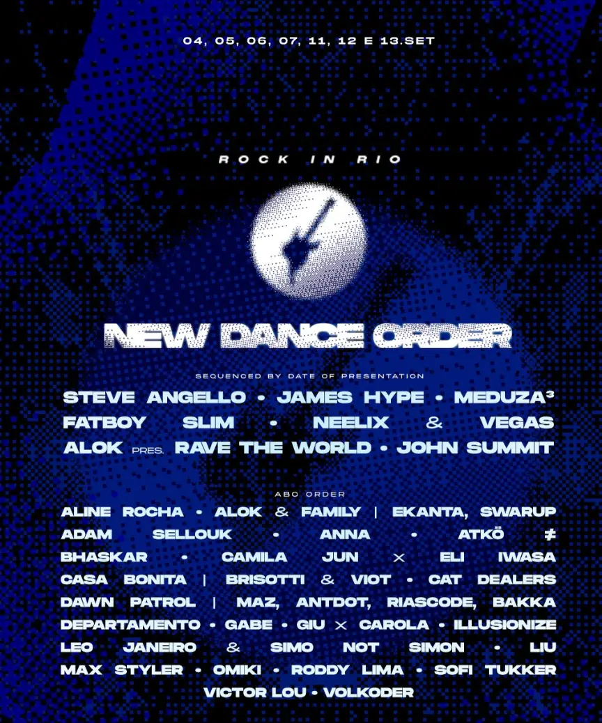 As novidades da próxima edição do Rock in Rio não param! Nesta terça-feira, a organização do festival anunciou mais detalhes do New Dance Order, que chega com um novo propósito que vai além da música: inspirado pelo movimento "Dancing for a Better World", o palco mobiliza toda a comunidade da música eletrônica – artistas, fãs e a indústria – na propagação de ideais que movimentam o mundo para uma direção de paz e um lugar melhor. Para traduzir esse chamado na busca por um mundo melhor, o palco promoverá, assim como o festival já fez em outras edições desde 1985, um momento simbólico e poderoso: um minuto de pausa, em silêncio e de reflexão, durante todos os sete dias de Rock in Rio. Na mesma direção e ampliando o alcance dessa mensagem, o line-up reúne alguns dos maiores nomes da cena eletrônica global e brasileira: no dia 4, Steve Angello é o headliner; James Hype encerra os shows no dia 5; MEDUZA³ é a principal atração do dia 6; o já anunciado Fatboy Slim lidera a noite do dia 7; na segunda semana, Neelix & Vegas encerram o dia 11; Alok, com o projeto Rave The World, no dia 12; e John Summit é o headliner no dia 13. Esses e mais outros 22 shows que acontecerão no palco abrirão um chamado de reflexão global: é preciso lembrar que é possível um mundo de paz, respeito, união, amor e diversidade – valores inegociáveis na cultura da música eletrônica e na cultura de pista, uma linguagem em forma de música que acolhe todos os credos, povos, religiões, culturas e visões de mundo.