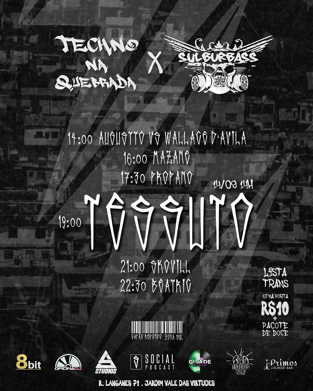 Multiartista, produtor, DJ e fundador da icônica festa CARLOS CAPSLOCK, Tessuto irá se apresentar neste final de semana no projeto Techno na Quebrada. Nesta edição especial, 90% do valor da venda dos ingressos será destinado a um projeto de Dia das Crianças liderado pela "Gb Drinks" (referência na região de atuação do projeto), trazendo diversão e bem estar às crianças dos bairros próximos.