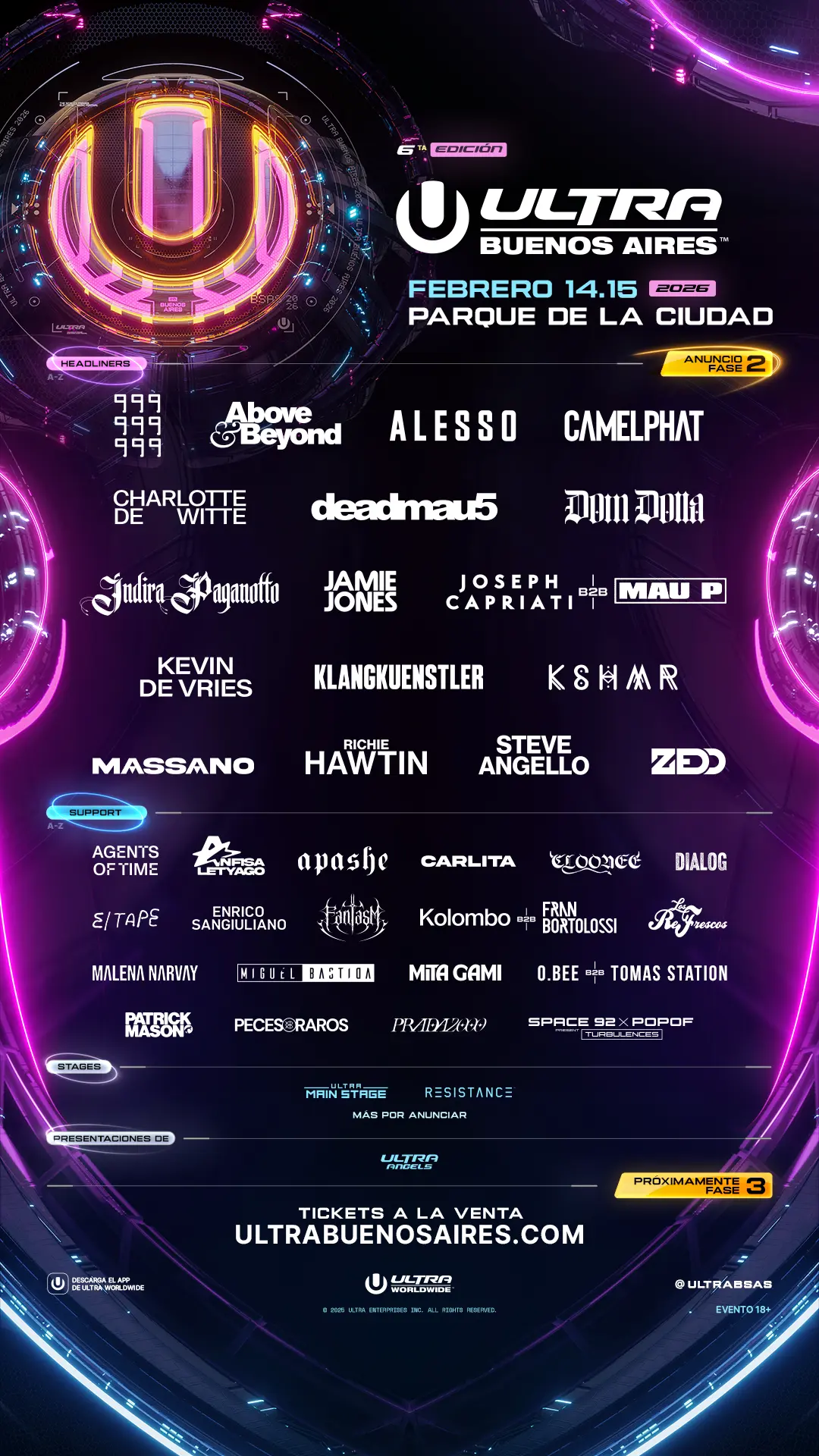 O ULTRA Buenos Aires acontecerá de sábado, 14, a domingo, 15 de fevereiro de 2026, no Parque de la Ciudad. Já confirmados no line up estão: Above & Beyond, CamelPhat, Charlotte de Witte, deadmau5, Dom Dolla, Indira Paganotto, Jamie Jones, Kevin de Vries, Klangkuenstler, Richie Hawtin, Steve Angello e o World Debut de Joseph Capriati b2b Mau P, Alesso, Zedd, 999999999, KSHMR, Massano, Cloonee, Anfisa Letyago, Enrico Sangiuliano, Space 92 B2B Popof apresentam Turbulences e muitos outros.